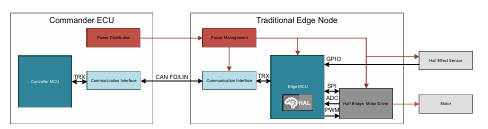 图 2 显示了传统边缘节点的方框图。在传统架构中,本地 MCU 包含 HAL,HAL 是定义器件软件驱动程序如何与硬件交互的软件。边缘 MCU 通过网络接口(通常是 CAN 灵活数据速率 (CAN FD) 本地互连网络)接收来自控制器 MCU 的命令,并根据控制器发出的指令控制本地硬件。