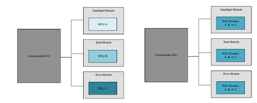 图 4 将传统方法(每个边缘节点模块使用不同供应商提供的不同 MCU,需要跨多个平台进行软件开发和管理)与远程控制边缘方法(图 4 中的标签“RCE 解决方案 A、B 或 C”代表多个供应商提供的无软件选项)进行了对比。基于标准的解决方案具有额外的优势,因为无论是哪家远程控制边缘解决方案供应商,命令器 ECU 的软件都保持一致。