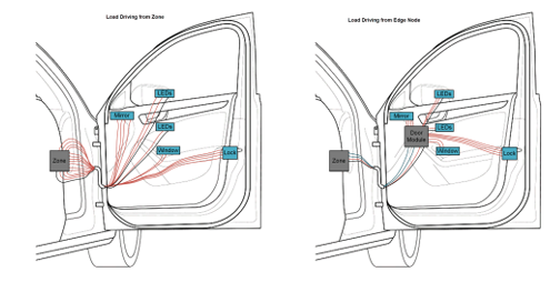 使用边缘节点而不是直接从命令器 ECU 驱动负载,缩短了连接负载驱动器的电线长度。远程控制边缘节点保持这一优势,同时还将 HAL 保留在命令器 ECU 中。图 5 以车门为例展示了区域架构中的这种配置。尽管区域控制器控制两个车门模块,但车门边缘模块缩短了负载布线,这也有助于通过尽量减少寄生电容电感来减少电磁干扰,对于需要更快开关时间的下一代 48V 车辆,这一点尤其重要。