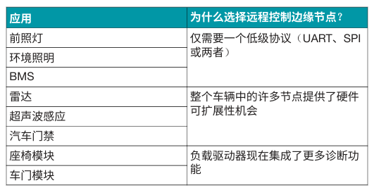 远程控制边缘技术在照明、电池管理系统 (BMS)、高级驾驶辅助系统 (ADAS)、汽车门禁和车身电机等众多应用中提供价值。表 1 列出了这些应用和远程控制边缘节点的优势。
