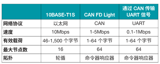 10BASE-T1S、CAN FD Light 和 UART over CAN 在速度、有效载荷容量以及多点和总线拓扑中的节点数量方面存在差异同。表 2 对这些协议进行了比较。