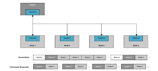 图 8 展示了轮循拓扑和命令器/响应器拓扑之间的差异。轮询拓扑循环运行,在每一周期,每个节点根据其节点 ID 有一个专属传输机会。这样,仲裁将自动进行,但需要进行调解以确保优先级或时间关键型数据不会因总线上的低优先级数据而延迟。命令器/响应器拓扑要求命令器 ECU 在总线上发送数据之前提示下游节点。传输顺序由命令器 ECU 而不是由节点 ID 决定。