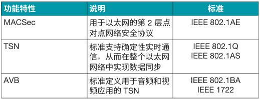 10BASE-T1S 由电气电子工程师协会 (IEEE) 802.3cg 实现标准化,它使用由技术委员会 18 制订标准的远程控制协议。其工作速率为 10Mbps 并采用轮询多点拓扑。作为以太网协议,10BASE-T1S 可以集成以太网功能,例如媒体访问控制安全 (MACSec)、时间敏感网络 (TSN)、音频视频桥接 (AVB) 和数据线供电 (PoDL)。表 3 介绍描述了这四个功能。此外,已经使用高速以太网主干网的系统可以在整个以太网网络受益于精简的软件。