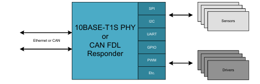 10BASE-T1S 和 CAN FD Light 协议将以太网和 CAN 桥接至 SPI、I2C、UART、GPIO 和 PWM 等其他协议(请参阅图 9)。这种桥接可通过 10BASE-T1S 和 CAN FD Light 实现多个传感器和驱动器的远程控制,使这两种解决方案可在各种终端应用中通用。