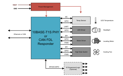 图 11. 使用 10BASE-T1S 或 CAN FD Light 的远程控制前照灯模块方框图