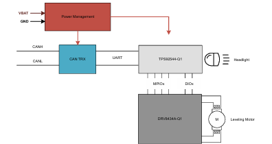 利用具有集成步进电机梯形控制功能的 TPS92544-Q1 开关 LED 驱动器和 DRV8434A-Q1 步进电机驱动器,TI 提供了采用 UART over CAN 协议的远程控制边缘前照灯解决方案。TPS92544-Q1 通过单个 UART 接口控制 LED 和电机,使其成为高效的前照灯模块解决方案。如图 12 所示,CAN 收发器用作来自命令器 ECU 的 UART 数据包的硬件介质。