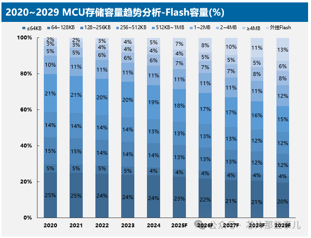 大部分MCU采用内嵌式eFlash工艺,仅部分指定场景需要将Flash外挂。当前eFlash存储容量仍以1MB以下“小存储”为主,2024年市场份额仍在七成以上。而汽车与工业场景4MB/8MB等大存储高性能MCU需求快速增长,因此,存储容量大于1MB的“大存储”MCU份额持续增长。
