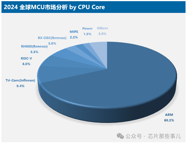 ARM在MCU领域布局较为完善,从超低功耗的M0/0+系列到高性能的M7系列,覆盖大部分应用场景需求,当前仍是市场主流,占比68.2%。瑞萨(Renesas)与英飞凌(Infineon)采用双核策略,即定制产品采用自研内核,通用产品采用ARM内核。近年,凭借低功耗、可定制、生态开放等优势,RISC-V在MCU领域异军突起,市场占比快速提升,2024年全球占比已达6%。