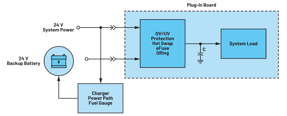 理想二极管有许多应用。以工业UPS备用电源系统(图3)为例。该系统使用24 V主电源。此电源的工作范围为19.2 VDC至30 VDC,瞬态电压可高达60 V。将24 V电池用作备用电源。为确保备用电源充分可用,在正常运行期间(当电池处于待机状态时),电池充满至24 V。当主电源中断时,电池提供备用电源,从24 V放电至19.2 V以下,直至系统不再运行,或者直至主电源恢复,以较早出现的情形为准。这里需要一个理想二极管电路来提供ORing功能,用于在系统电源和备用电池之间切换。除了ORing功能,该系统还需要过压、欠压、热插拔和eFuse保护,以防范常见的系统故障,增强系统鲁棒性。
