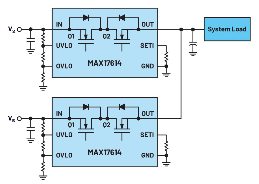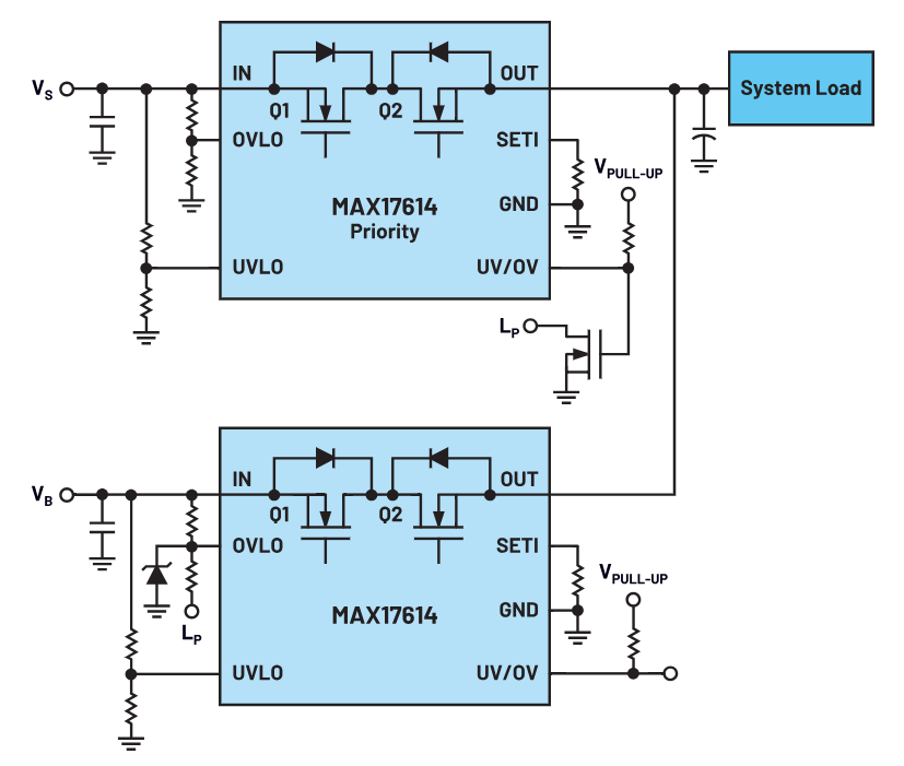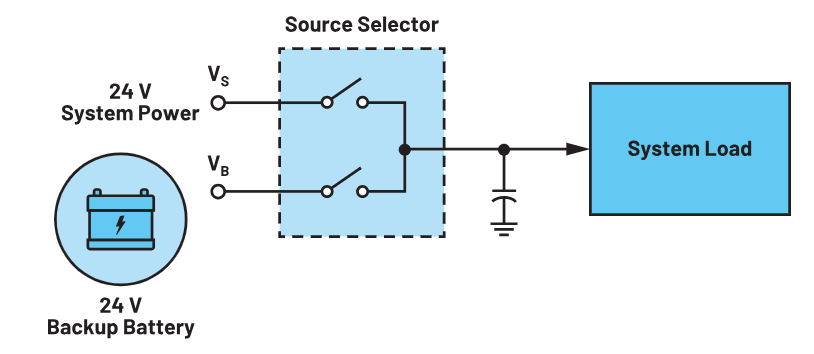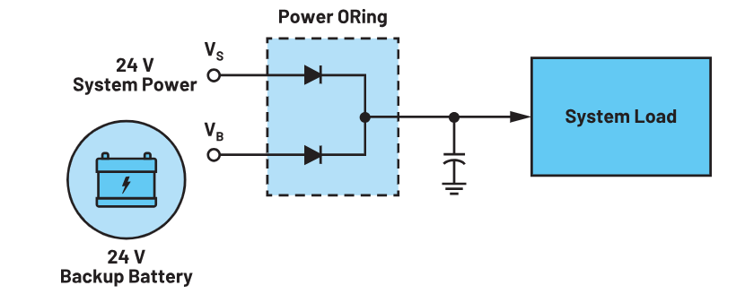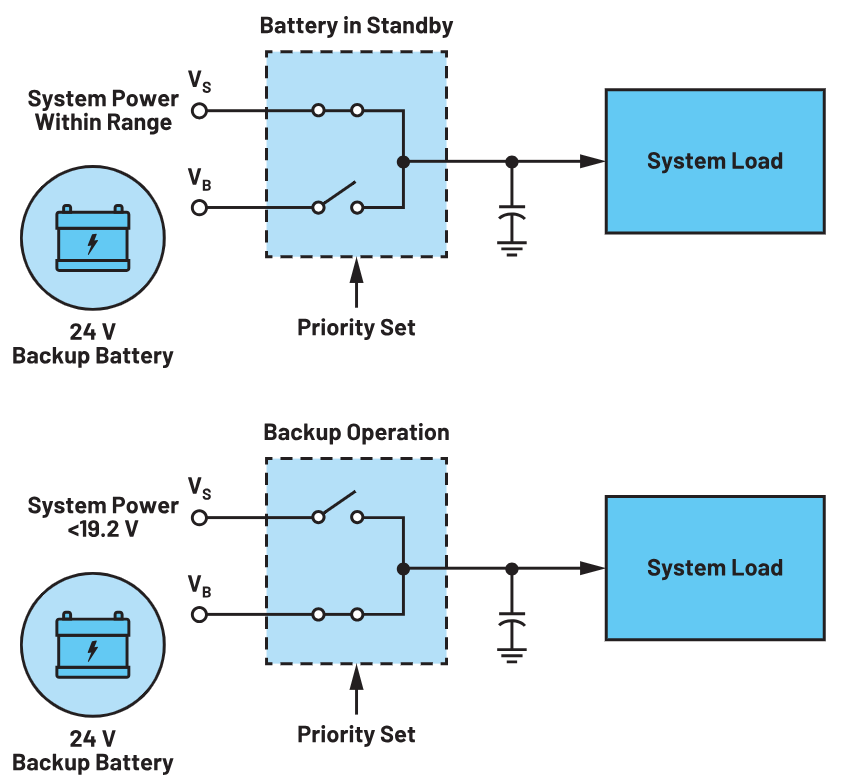 在这个用例中,简单的ORing功能是不够的,原因有二。首先,电池电压与系统标称电压24 V差不多。两个电源可能会来回切换,这是我们不希望看到的。源阻抗和负载电流的影响进一步放大了这个问题。例如,当VS为负载供电时,负载电流会在VS源阻抗两端产生压降,使其端电压降至略低于电池端电压(当前空载)的水平。电池随即接通,现在承载负载电流,这同样会在电池阻抗两端产生压降,导致电池端电压下降。同时,在无负载情况下,主电源端电压升高,使得VS试图接管。在这种情况下,就会在两个电源之间持续振荡直到两个电压彼此偏离为止。