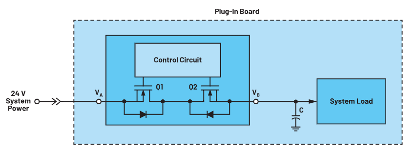 原有的Q1可以控制和阻断从VB流向VA的反向电流。添加的MOSFET Q2可以控制和阻断从VA流向VB的正向电流。