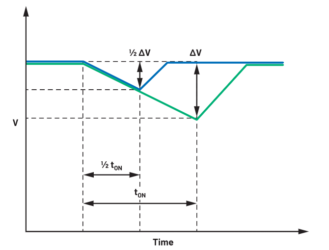 在没有备用电池的系统中(图8),电容C提供备用电源,通常称其为保持电容。在这种配置中,VS上的瞬态过压条件会触发Q2(图8)关断。电容提供必要的电力以保持系统运行,同时其电压因放电而下降。当VS回到正常工作范围时,Q2重新导通。Q2重新导通的时间tON必须很短,使电容压降尽可能低。图9显示了一个相对比较结果,在保持电容量相同的情况下,一半tON可将压降降低一半。