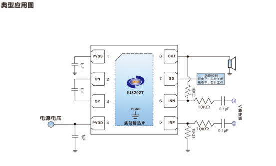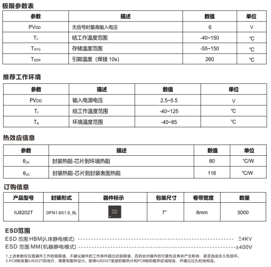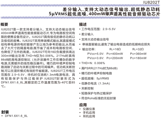 在仪器仪表、手机、耳机等电路板空间受限的便携设备音频设计中,常面临元件体积大、音频噪声明显、功耗过高及低频响应损失等问题,IU8202T 可针对性应对这些需求。该器件是一款单声道高性能音频驱动芯片,采用 DFN1.6X1.6_8L 超小封装,工作电压范围 2.5~5.5V,支持差分输入与大动态信号输出,单端直驱模式无需隔直电容,既节省空间成本,又避免低频响应损失。其输出功率可达 400mW(16Ω 负载、5.0V 供电),THD+N 仅 0.006%,底噪低至 5μVRMS,217Hz 时电源抑制比达 86dB,可适配嘈杂数字电源无需额外线性稳压器。内置咔嗒声抑制电路消除启停噪声,低功耗关断控制节省能源,同时具备短路保护与热过载保护,静态电流仅 1.3mA,工作温度范围 - 40℃至 85℃,为便携设备的高效稳定音频输出提供支撑。