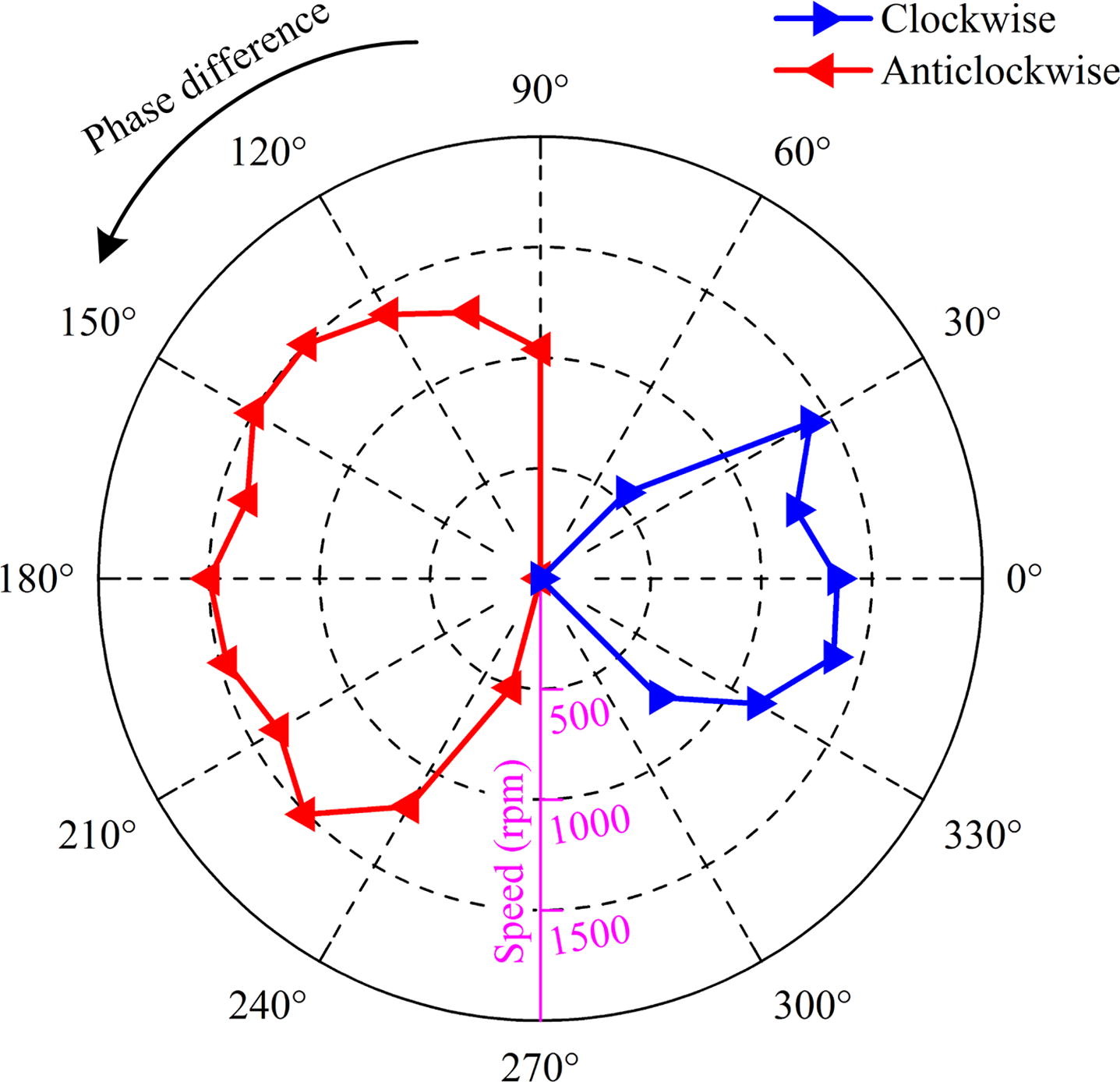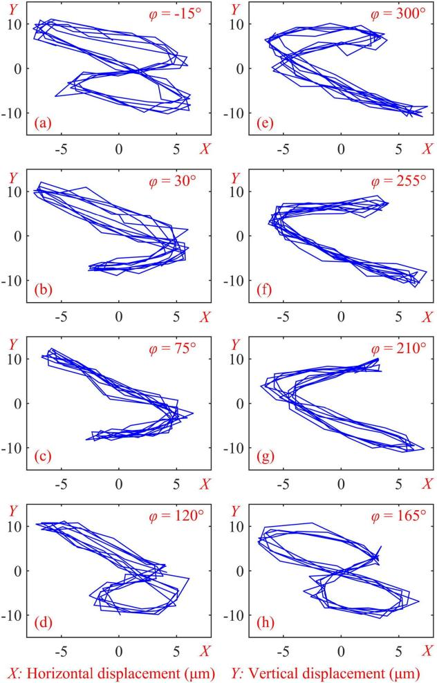 用函数信号放大器产生信号,经过功放(ATA-4051)放大后施加到超声电机上,打开传感器采集功能,完成振动轨迹采集。改变激励信号中两种信号的相位差,从0~360度范围内,每15度测试一次,共测24次。