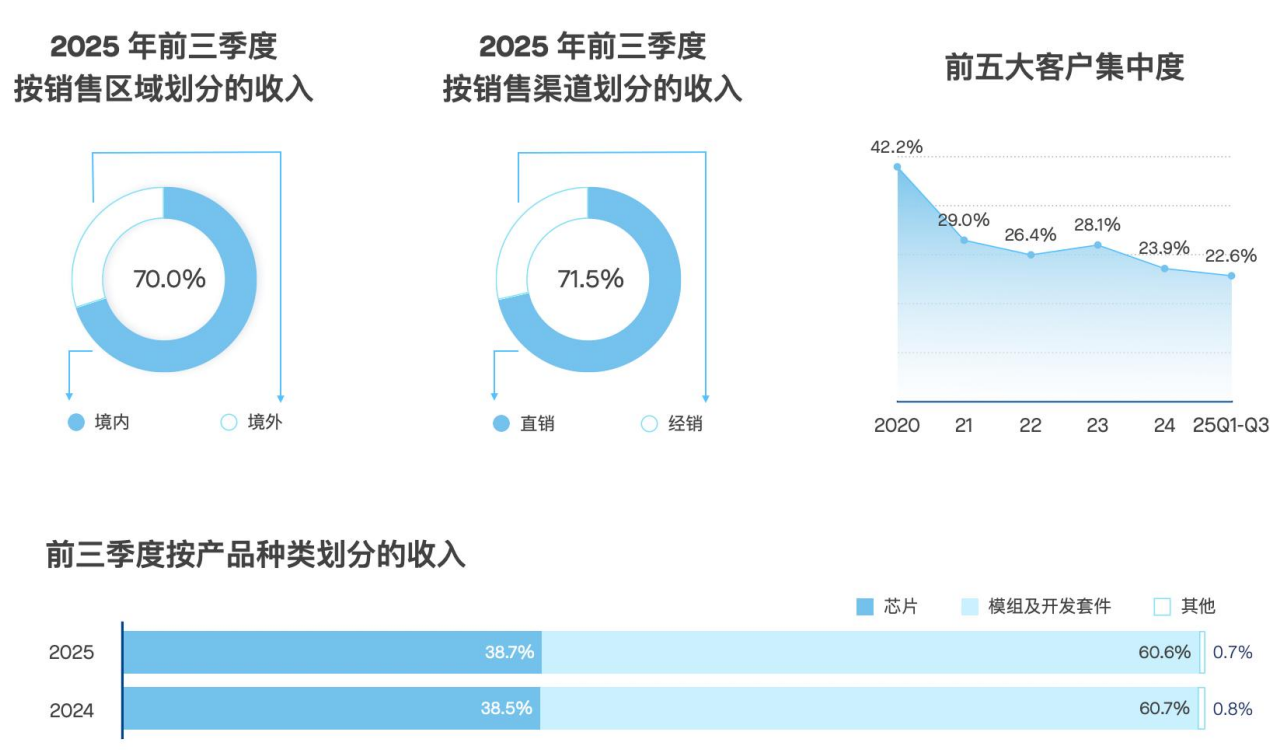 此外,公司从单一WiFi MCU向多协议SoC(如Wi-Fi 6/6E、蓝牙、Thread/Zigbee)扩展,2025年推出的ESP32-C5(Wi-Fi 6)和ESP32-P4(高性能AI边缘计算芯片)进一步强化在RISC-V架构和端侧AI的能力。模组及开发套件收入占比60.6%,芯片收入占比38.7%,显示公司从硬件到解决方案的协同效应增强。产品矩阵扩展良好,形成一定的技术壁垒。