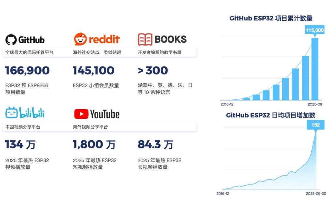 另外值得一提的是乐鑫的开源社区生态构成了核心护城河。截至2025年三季度,GitHub上ESP32项目数增至11.5万个(半年增长1.4万个),日均新增项目达152个。活跃的开发者社群不仅反哺产品迭代,还降低了客户开发门槛,形成软硬件一体化的差异化优势。