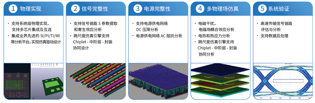 - Chiplet 先进封装设计平台:从芯片、Interposer 到封装的跨层级协同设计与多物理分析,面向“AI 芯片级”应用,解决多项互连、供电与散热挑战