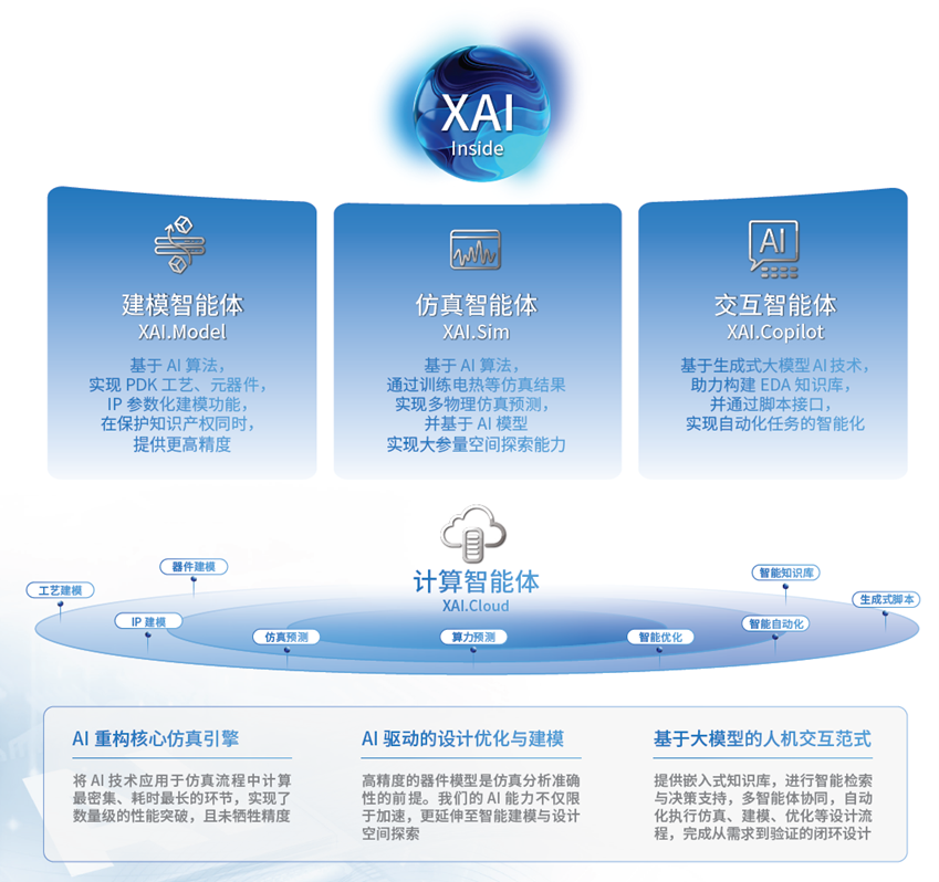 AI不仅加速仿真,更重构EDA工作流。芯和推出的XAI多智能体平台,将建模、仿真、交互、数据四大智能体融入设计流程,实现“仿真驱动设计”。工程师从“工具操作者”转变为“系统架构师”,设计效率提升数倍,仿真时间从天级缩短至秒级。