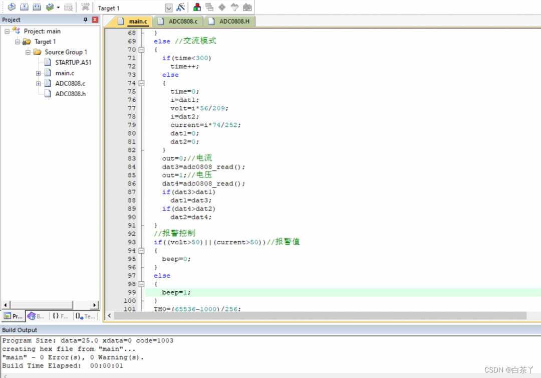 4、电压超过50V,或电流超过5A,蜂鸣器响(可修改程序来改变报警值)。