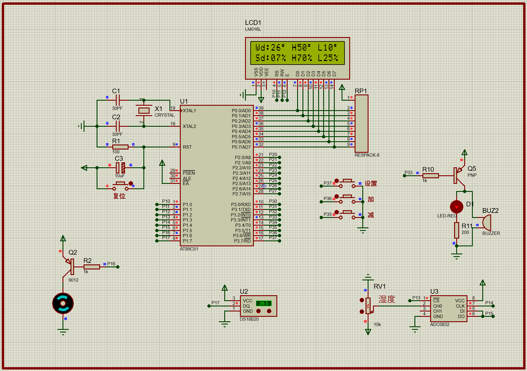 c.通过DS18B20温度传感器提供温度信息,滑动变阻器模拟湿度信息。