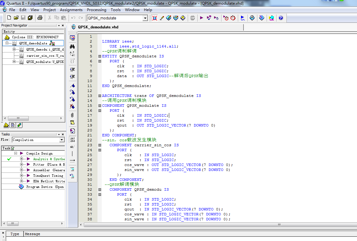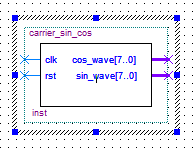 LIBRARY?ieee; ???USE?ieee.std_logic_1164.all; ???USE?ieee.std_logic_unsigned.all; ??? --sin,cos载波产生模块 ENTITY?carrier_sin_cos?IS ???PORT?( ??????clk???????:?IN?STD_LOGIC; ??????rst???????:?IN?STD_LOGIC; ??????cos_wave??:?OUT?STD_LOGIC_VECTOR(7?DOWNTO?0);--cos波 ??????sin_wave??:?OUT?STD_LOGIC_VECTOR(7?DOWNTO?0)--sin波 ???); END?carrier_sin_cos; ARCHITECTURE?trans?OF?carrier_sin_cos?IS ??? ???SIGNAL?valu????:?STD_LOGIC_VECTOR(7?DOWNTO?0)?:=?"00000000"; ???SIGNAL?count???:?STD_LOGIC_VECTOR(4?DOWNTO?0)?:=?"00000"; ??? ???SIGNAL?valu_2??:?STD_LOGIC_VECTOR(7?DOWNTO?0)?:=?"00000000"; ???SIGNAL?count_2?:?STD_LOGIC_VECTOR(4?DOWNTO?0)?:=?"00000"; BEGIN ???PROCESS?(clk) ???BEGIN ??????IF?(clk'EVENT?AND?clk?=?'1')?THEN ?????????IF?(rst?=?'1')?THEN ????????????count?<=?"00000"; ?????????ELSIF?(count?=?"11111")?THEN ????????????count?<=?"00000"; ?????????ELSE ????????????count?<=?count?+?"00001";--波形地址累加器 ?????????END?IF; ??????END?IF; ???END?PROCESS;