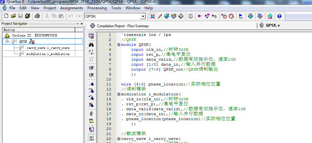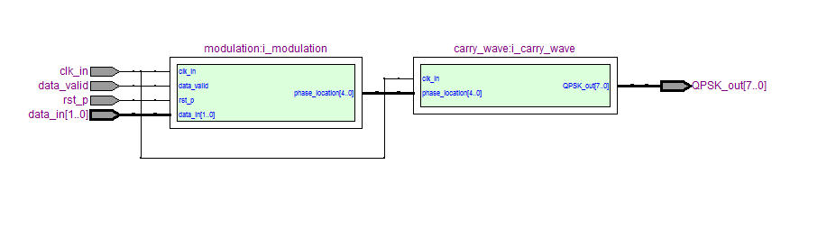 `timescale?1ns?/?1ps //QPSK module?QPSK( ????input?clk_in,//时钟320M ????input?rst_p,//高电平复位 input?data_valid,//数据有效指示位,速率10M input?[1:0]?data_in,//输入并行数据 ????output?[7:0]?QPSK_out//QPSK调制输出 ????); wire?[4:0]?phase_location;//实际相位位置 //调制模块 modulation?i_modulation( .?clk_in(clk_in),//时钟320M .?rst_p(rst_p),//高电平复位 .?data_valid(data_valid),//数据有效指示位,速率10M .?data_in(data_in),//输入并行数据 .?phase_location(phase_location)//实际相位位置 ????);