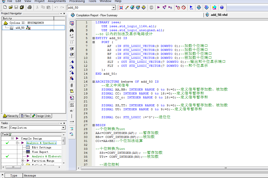 名称:50以内的加法及显示电路设计VHDL代码Quartus仿真