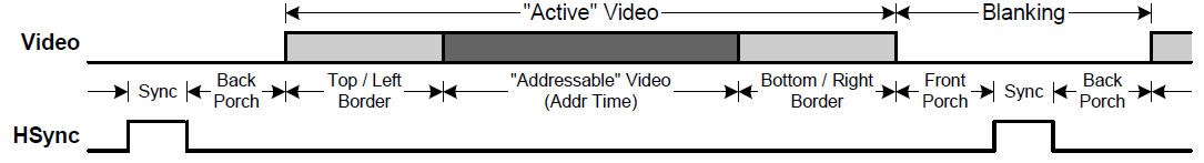 VGA?扫描,基本元素是行扫描,多行组成一帧,下图显示一行的时序,其中“Active”Video?是一行视频的有效像素,大部分分辨率时钟中?Top/Left Border?和?Bottom / Right Border?都是?0。