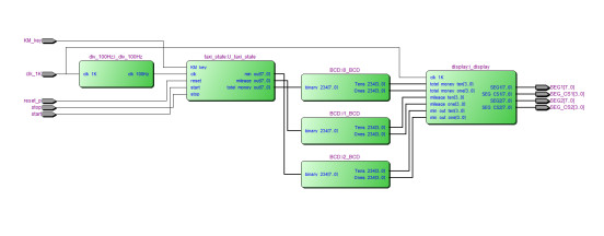 module?taxi_fee( input?clk_1K,//标准时钟 input?reset_p,//复位信号 input?KM_key,//里程按键 input?stop,//中途暂停 input?start,//启动信号,行程开始,高有效? output?[3:0]?SEG_CS1,//数码管1段选 output?[7:0]?SEG1,//数码管1位选 output?[3:0]?SEG_CS2,//数码管2段选 output?[7:0]?SEG2//数码管2位选 ); wire?[7:0]?totel_money; wire?[7:0]?mileage; wire?[7:0]?min_out; wire?[3:0]?totel_money_ten; wire?[3:0]?totel_money_one; wire?[3:0]?mileage_ten; wire?[3:0]?mileage_one; wire?[3:0]?min_out_ten; wire?[3:0]?min_out_one; wire?clk_100Hz; //分频到100Hz div_100Hz?i_div_100Hz( .?clk_1K(clk_1K), .?clk_100Hz(clk_100Hz) );