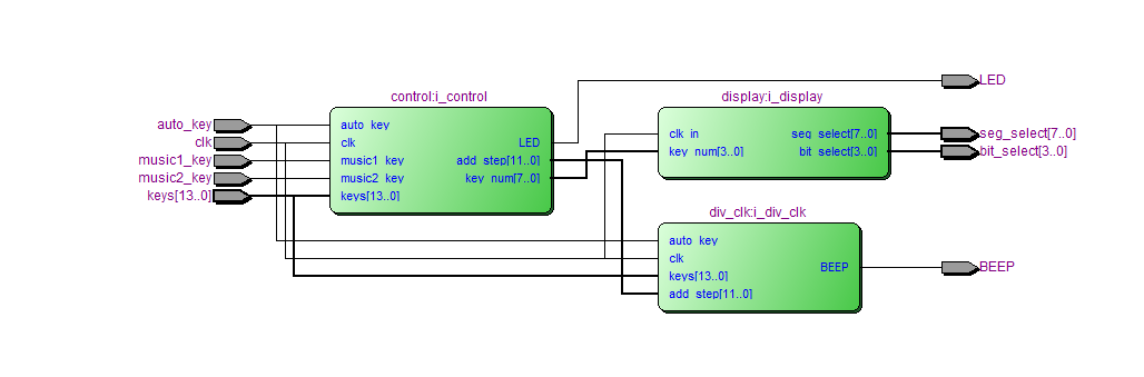 //电子琴 module?dianziqin(clk,keys,BEEP,auto_key,seg_select,bit_select,music1_key,music2_key,LED); input????????clk;//10MHz input????????[13:0]keys;//14个琴键 input??auto_key;//自动播放开关,1自动播放,0按键模式 output???????BEEP;//蜂鸣器输出 output???????LED;//LED?高音指示 output?[7:0]?seg_select;//数码管段选显示 output?[3:0]?bit_select;//数码管位选显示 input??music1_key;//歌曲1 input??music2_key;//歌曲2 wire?[11:0]?add_step; wire?[7:0]?key_num;//按键号 //分频模块 div_clk?i_div_clk( .clk(clk), .auto_key(auto_key), .keys(keys), .BEEP(BEEP), .add_step(add_step) ); //琴键控制 control?i_control( .clk(clk), .keys(keys), .key_num(key_num), .add_step(add_step), .music1_key(music1_key),//歌曲1 .music2_key(music2_key),//歌曲2 .LED(LED), .auto_key(auto_key) );