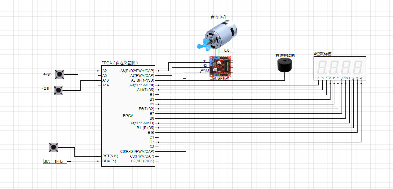 设计基于FPGA的简单数控机床的设计,要求粗加工过程40秒,控制电机正转20秒,反转20秒;精加工过程20,控制电机正转10秒,反转10秒,在机床加工过程均可停止;加工模式不同转速不同;全部加工过程均自动完成并在结束时通过报警提示;整个过程要求用数码管显示当前工作时间(倒计时)。