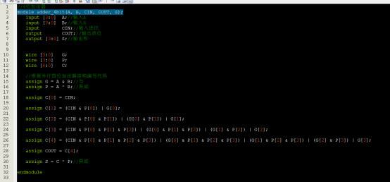 //4位加法器 module?adder_4bit(A,?B,?CIN,?COUT,?S); ???input?[3:0]??A;//输入A ???input?[3:0]??B;//输入B ???input????????CIN;//输入进位 ???output???????COUT;//输出进位 ???output?[3:0]?S;//输出和 ??? ??? ???wire?[3:0]???G; ???wire?[3:0]???P; ???wire?[4:0]???C; ??? ???//根据并行四位加法器结构编写代码 ???assign?G?=?A?&?B;//与 ???assign?P?=?A?^?B;//异或 ??? ???assign?C[0]?=?CIN; ??? ???assign?C[1]?=?(CIN?&?P[0])?|?G[0]; ??? ???assign?C[2]?=?(CIN?&?P[0]?&?P[1])?|?(G[0]?&?P[1])?|?G[1]; ??? ???assign?C[3]?=?(CIN?&?P[0]?&?P[1]?&?P[2])?|?(G[0]?&?P[1]?&?P[2])?|?(G[1]?&?P[2])?|?G[2]; ??? ???assign?C[4]?=?(CIN?&?P[0]?&?P[1]?&?P[2]?&?P[3])?|?(G[0]?&?P[1]?&?P[2]?&?P[3])?|?(G[1]?&?P[2]?&?P[3])?|?(G[2]?&?P[3])?|?G[3]; ??? ???assign?COUT?=?C[4]; ??? ???assign?S?=?C?^?P;//异或 ??? endmodule