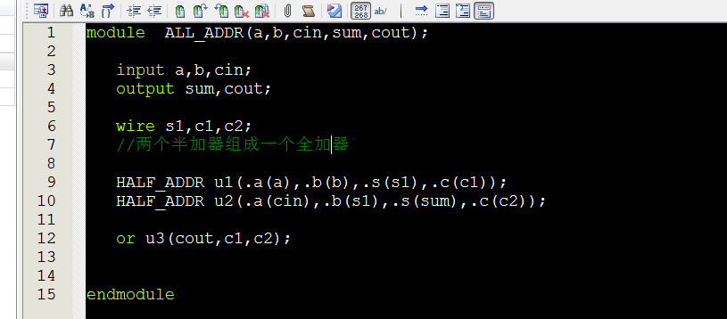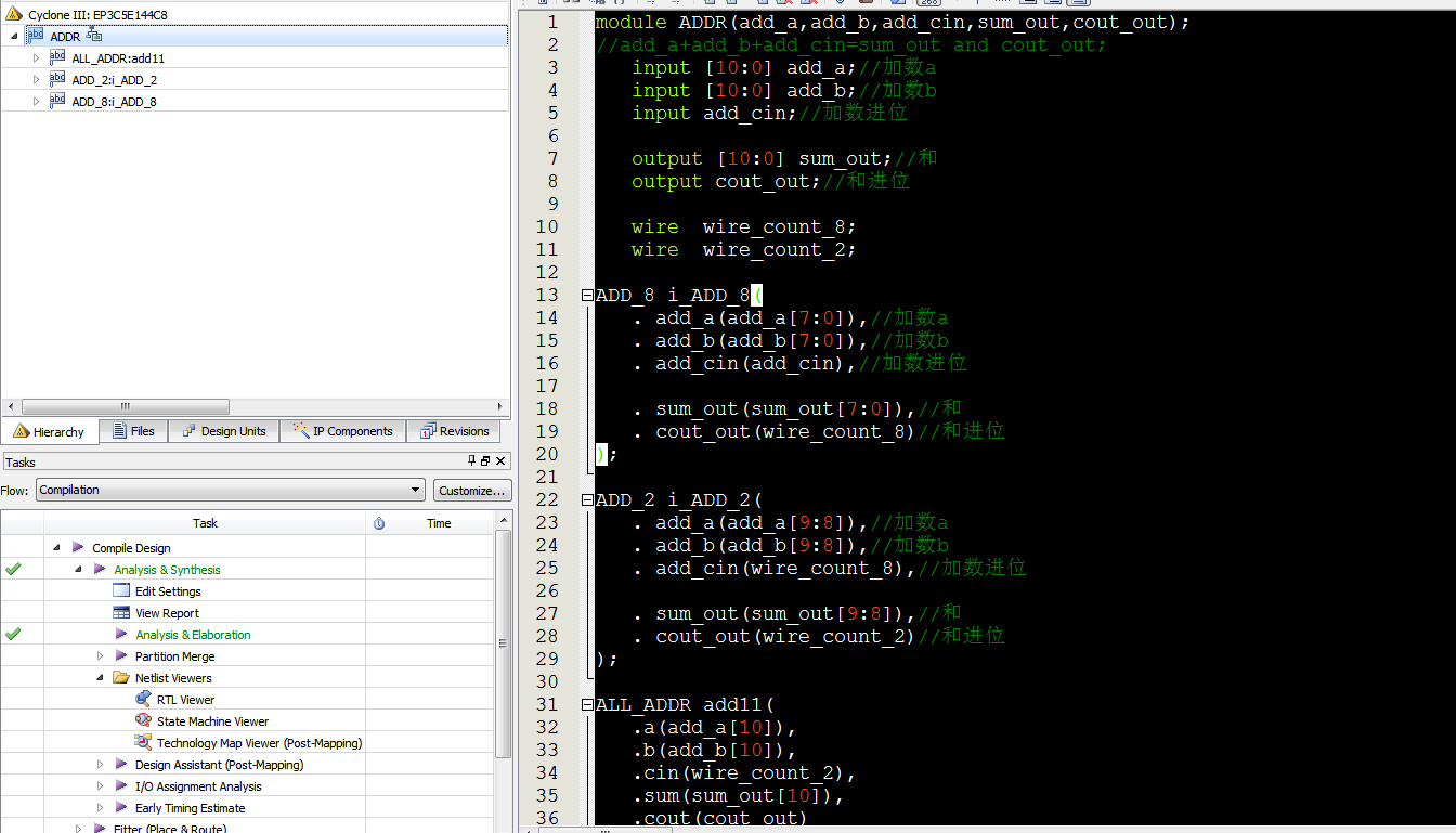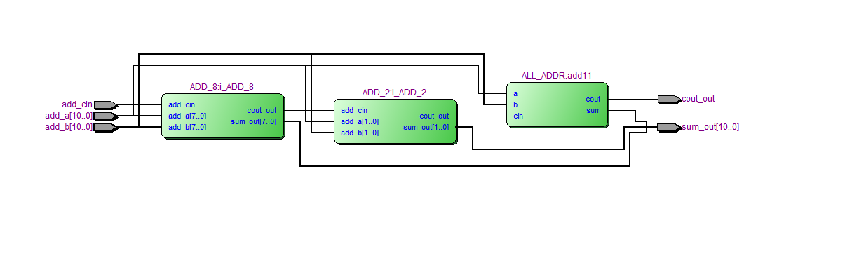 然后将上述3个全加器串联,组成11位加法器