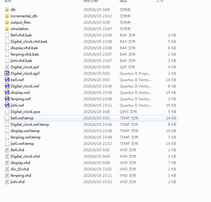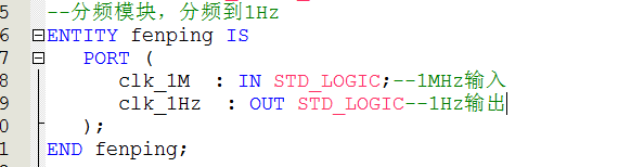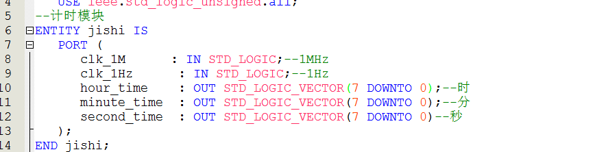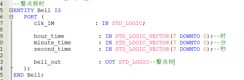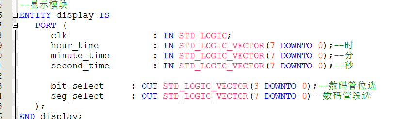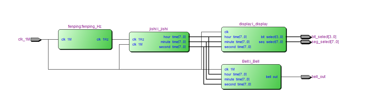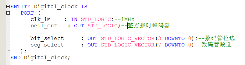 LIBRARY?ieee; ???USE?ieee.std_logic_1164.all; ENTITY?Digital_clock?IS ???PORT?( ??????clk_1M????:?IN?STD_LOGIC;--1MHz ??????bell_out???:?OUT?STD_LOGIC;--整点报时蜂鸣器 ??????bit_select?????:?OUT?STD_LOGIC_VECTOR(3?DOWNTO?0);--数码管位选 ??????seg_select?????:?OUT?STD_LOGIC_VECTOR(7?DOWNTO?0)--数码管段选 ???); END?Digital_clock; ARCHITECTURE?trans?OF?Digital_clock?IS --模块声明 ???COMPONENT?Bell?IS ??????PORT?( ?????????clk_1M????:?IN?STD_LOGIC; ?????????hour_time??:?IN?STD_LOGIC_VECTOR(7?DOWNTO?0); ?????????minute_time?:?IN?STD_LOGIC_VECTOR(7?DOWNTO?0); ?????????second_time?:?IN?STD_LOGIC_VECTOR(7?DOWNTO?0); ?????????bell_out???:?OUT?STD_LOGIC ??????); ???END?COMPONENT; ??? ???COMPONENT?display?IS ??????PORT?( ?????????clk????????:?IN?STD_LOGIC; ?????????hour_time??:?IN?STD_LOGIC_VECTOR(7?DOWNTO?0); ?????????minute_time?:?IN?STD_LOGIC_VECTOR(7?DOWNTO?0); ?????????second_time?:?IN?STD_LOGIC_VECTOR(7?DOWNTO?0); bit_select?????:?OUT?STD_LOGIC_VECTOR(3?DOWNTO?0);--数码管位选 seg_select?????:?OUT?STD_LOGIC_VECTOR(7?DOWNTO?0)--数码管段选 ??????); ???END?COMPONENT; ??? ???COMPONENT?fenping?IS ??????PORT?( ?????????clk_1M????:?IN?STD_LOGIC; ?????????clk_1Hz????:?OUT?STD_LOGIC ??????); ???END?COMPONENT; ??? ???COMPONENT?jishi?IS ??????PORT?( ?????????clk_1M????:?IN?STD_LOGIC; ?????????clk_1Hz????:?IN?STD_LOGIC; ?????????hour_time??:?OUT?STD_LOGIC_VECTOR(7?DOWNTO?0); ?????????minute_time?:?OUT?STD_LOGIC_VECTOR(7?DOWNTO?0); ?????????second_time?:?OUT?STD_LOGIC_VECTOR(7?DOWNTO?0) ??????); ???END?COMPONENT;
