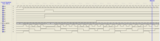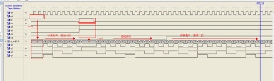 上图为异步清零,同步置数可调加减的十进制计数器的仿真图,图中可看到在0~50ns的时间段RST信号为低电平,对应的输出Q3~Q0均为低电平,实现了异步清零功能。在200ns~260ns的时间段,RST为高电平,LD信号为低电平应该执行同步置数功能,即输出Q3~Q0等于D3~D0,观察仿真图可以看到,
