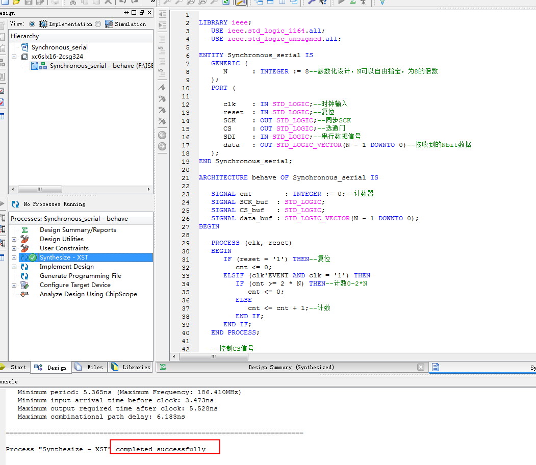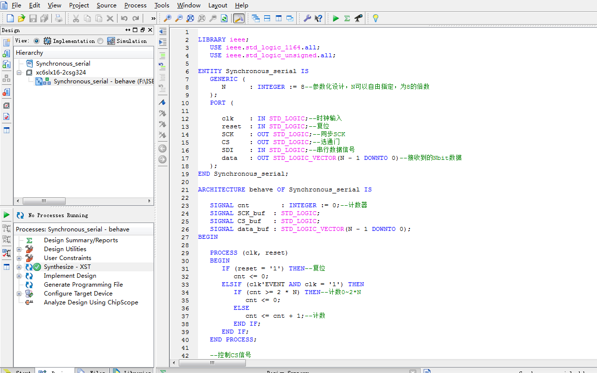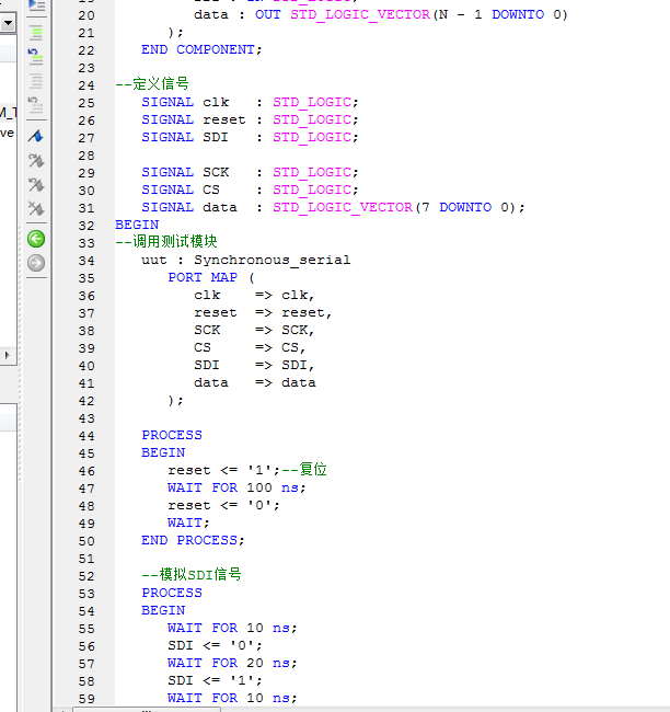 LIBRARY?ieee; ???USE?ieee.std_logic_1164.all; ???USE?ieee.std_logic_unsigned.all; ENTITY?Synchronous_serial?IS ???GENERIC?( ??????N??????:?INTEGER?:=?8--参数化设计,N可以自由指定,为8的倍数 ???); ???PORT?( ?????? ??????clk????:?IN?STD_LOGIC;--时钟输入 ??????reset??:?IN?STD_LOGIC;--复位 ??????SCK????:?OUT?STD_LOGIC;--同步SCK ??????CS?????:?OUT?STD_LOGIC;--选通门 ??????SDI????:?IN?STD_LOGIC;--串行数据信号 ??????data???:?OUT?STD_LOGIC_VECTOR(N?-?1?DOWNTO?0)--接收到的Nbit数据 ???); END?Synchronous_serial; ARCHITECTURE?behave?OF?Synchronous_serial?IS ??? ???SIGNAL?cnt????????:?INTEGER?:=?0;--计数器 ???SIGNAL?SCK_buf??:?STD_LOGIC; ???SIGNAL?CS_buf???:?STD_LOGIC; ???SIGNAL?data_buf?:?STD_LOGIC_VECTOR(N?-?1?DOWNTO?0); BEGIN ???PROCESS?(clk,?reset) ???BEGIN ??????IF?(reset?=?'1')?THEN--复位 ?????????cnt?<=?0; ??????ELSIF?(clk'EVENT?AND?clk?=?'1')?THEN ?????????IF?(cnt?>=?2?*?N)?THEN--计数0~2*N ????????????cnt?<=?0; ?????????ELSE ????????????cnt?<=?cnt?+?1;--计数 ?????????END?IF; ??????END?IF; ???END?PROCESS; ??? ???--控制CS信号 ???PROCESS?(clk,?reset) ???BEGIN ??????IF?(reset?=?'1')?THEN--复位 ?????????CS_buf?<=?'1';--默认高电平 ??????ELSIF?(clk'EVENT?AND?clk?=?'1')?THEN ?????????IF?(cnt?>?N)?THEN--大于N ????????????CS_buf?<=?'0';--低电平 ?????????ELSE ????????????CS_buf?<=?'1';--高电平 ?????????END?IF; ??????END?IF; ???END?PROCESS;