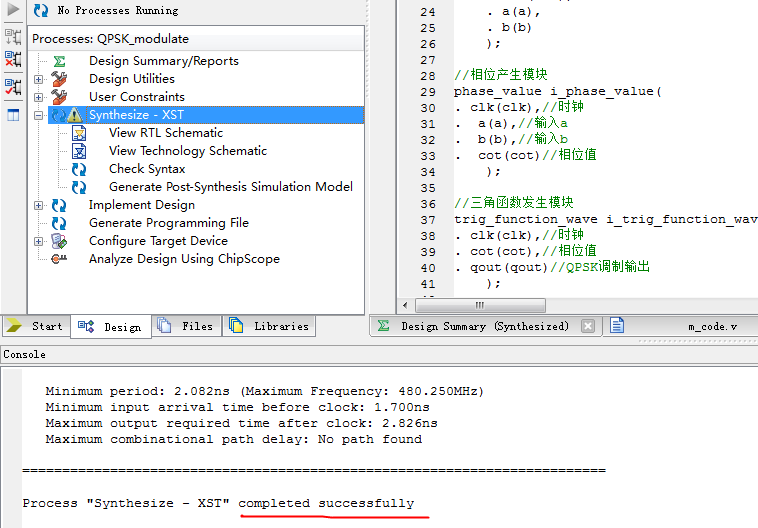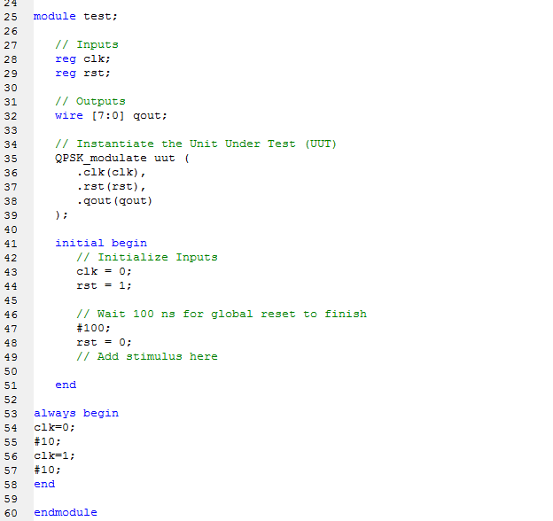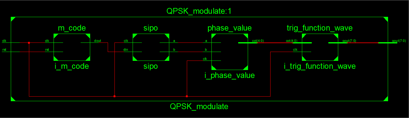 module?QPSK_modulate( ????input?clk,//时钟 ????input?rst,//复位 ????output?[7:0]?qout//QPSK调制输出 ????); wire?din; wire?a; wire?b; wire?[4:0]cot; //m序列发生器,用于模拟调制信号 m_code?i_m_code( .?clk(clk), .?rst(rst), .?dout(din)//输出m序列(伪随机序列) ????); //串并转换 sipo?sipo( ????.?clk(clk),//时钟 ????.?din(din),//调制信号输入 ????.?a(a), ????.?b(b) ????); //相位产生模块 phase_value?i_phase_value( .?clk(clk),//时钟 .??a(a),//输入a .??b(b),//输入b
