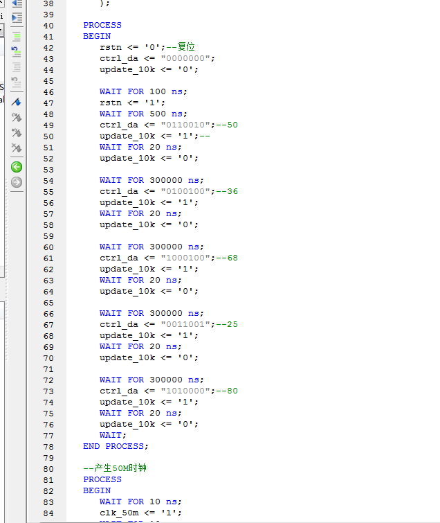 LIBRARY?ieee; ???USE?ieee.std_logic_1164.all; ENTITY?tb_pwm_ctrl?IS END?tb_pwm_ctrl; ARCHITECTURE?behaveral?OF?tb_pwm_ctrl?IS ???COMPONENT?pwm_ctrl?IS ??????PORT?( ?????????clk_50m?:?IN?STD_LOGIC; ?????????rstn?:?IN?STD_LOGIC; ?????????ctrl_da?:?IN?STD_LOGIC_VECTOR(6?DOWNTO?0); ?????????update_10k?:?IN?STD_LOGIC; ?????????pwm_out?:?OUT?STD_LOGIC ??????); ???END?COMPONENT; ??? ??? ???SIGNAL?clk_50m????:?STD_LOGIC; ???SIGNAL?rstn???????:?STD_LOGIC; ???SIGNAL?ctrl_da????:?STD_LOGIC_VECTOR(6?DOWNTO?0); ???SIGNAL?update_10k?:?STD_LOGIC; ??? ???SIGNAL?pwm_out????:?STD_LOGIC; BEGIN ??? ??? ??? ???uut?:?pwm_ctrl ??????PORT?MAP?( ?????????clk_50m?????=>?clk_50m, ?????????rstn????????=>?rstn, ?????????ctrl_da?????=>?ctrl_da, ?????????update_10k??=>?update_10k, ?????????pwm_out?????=>?pwm_out ??????); ??? ???PROCESS? ???BEGIN ??????rstn?<=?'0';--复位 ??????ctrl_da?<=?"0000000"; ??????update_10k?<=?'0'; ?????? ??????WAIT?FOR?100?ns; ??????rstn?<=?'1'; ??????WAIT?FOR?500?ns; ??????ctrl_da?<=?"0110010";--50 ??????update_10k?<=?'1';-- ??????WAIT?FOR?20?ns; ??????update_10k?<=?'0'; ?????? ??????WAIT?FOR?300000?ns; ??????ctrl_da?<=?"0100100";--36 ??????update_10k?<=?'1'; ??????WAIT?FOR?20?ns; ??????update_10k?<=?'0'; ?????? ??????WAIT?FOR?300000?ns; ??????ctrl_da?<=?"1000100";--68 ??????update_10k?<=?'1'; ??????WAIT?FOR?20?ns; ??????update_10k?<=?'0'; ?????? ??????WAIT?FOR?300000?ns; ??????ctrl_da?<=?"0011001";--25 ??????update_10k?<=?'1'; ??????WAIT?FOR?20?ns; ??????update_10k?<=?'0'; ?????? ??????WAIT?FOR?300000?ns; ??????ctrl_da?<=?"1010000";--80 ??????update_10k?<=?'1'; ??????WAIT?FOR?20?ns; ??????update_10k?<=?'0'; ??????WAIT; ???END?PROCESS;
