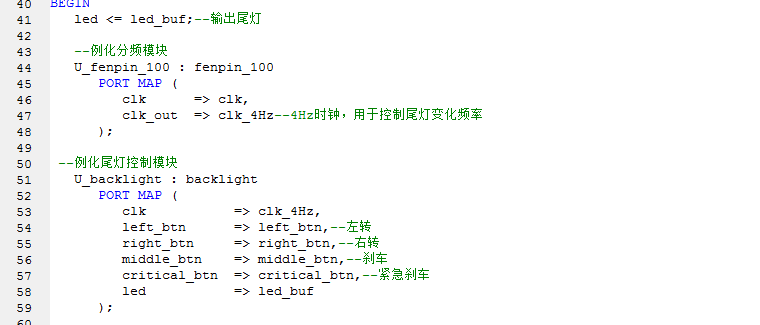 LIBRARY?ieee; ???USE?ieee.std_logic_1164.all; ???USE?ieee.std_logic_unsigned.all; --尾灯控制模块 ENTITY?backlight?IS ???PORT?( ??????clk???????????:?IN?STD_LOGIC; ??????left_btn??????:?IN?STD_LOGIC;--左转 ??????right_btn?????:?IN?STD_LOGIC;--右转 ??????middle_btn????:?IN?STD_LOGIC;--刹车 ??????critical_btn??:?IN?STD_LOGIC;--紧急刹车 ??????led???????????:?OUT?STD_LOGIC_VECTOR(6?DOWNTO?0) ???); END?backlight; ARCHITECTURE?trans?OF?backlight?IS ??? ???SIGNAL?left_cnt?????:?STD_LOGIC_VECTOR(1?DOWNTO?0)?:=?"00"; ??? ???SIGNAL?left_light???:?STD_LOGIC_VECTOR(6?DOWNTO?0)?:=?"0000000"; ??? ???SIGNAL?right_cnt????:?STD_LOGIC_VECTOR(1?DOWNTO?0)?:=?"00"; ??? ???SIGNAL?right_light??:?STD_LOGIC_VECTOR(6?DOWNTO?0)?:=?"0000000"; ???SIGNAL?stop_cnt?????:?STD_LOGIC_VECTOR(1?DOWNTO?0)?:=?"00"; ??? ???SIGNAL?stop_light???:?STD_LOGIC_VECTOR(6?DOWNTO?0)?:=?"0000000"; ??? ???SIGNAL?double_cnt???:?STD_LOGIC_VECTOR(1?DOWNTO?0)?:=?"00"; ??? ???SIGNAL?double_light?:?STD_LOGIC_VECTOR(6?DOWNTO?0)?:=?"0000000"; BEGIN ???PROCESS?(clk) ???BEGIN ??????IF?(clk'EVENT?AND?clk?=?'1')?THEN ?????????IF?(left_btn?=?'1'?AND?right_btn?=?'0')?THEN--左转时 ????????????left_cnt?<=?left_cnt?+?"01";--计数器累加 ?????????ELSE ????????????left_cnt?<=?"00"; ?????????END?IF; ??????END?IF; ???END?PROCESS;