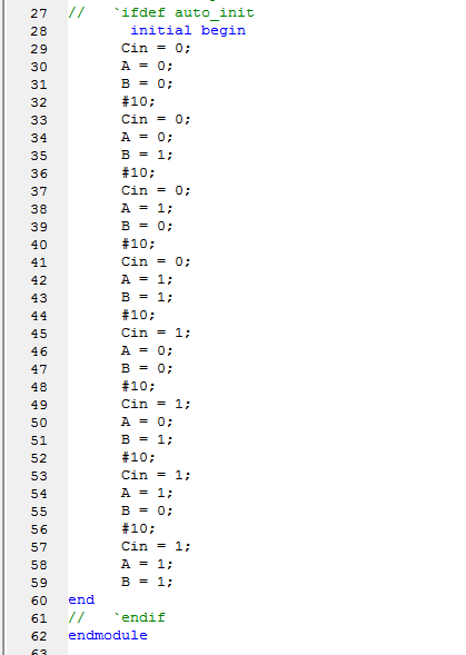 //?Verilog?test?fixture?created?from?schematic?F:ISE_programadder_sch_Z215adder_schfull_add.sch?-?Sun?Oct?10?16:27:50?2021 `timescale?1ns?/?1ps module?full_add_full_add_sch_tb(); //?Inputs ???reg?Cin; ???reg?A; ???reg?B; //?Output ???wire?CO; ???wire?SO; //?Bidirs //?Instantiate?the?UUT ???full_add?UUT?( .CO(CO),? .SO(SO),? .Cin(Cin),? .A(A),? .B(B) ???); //?Initialize?Inputs //???`ifdef?auto_init ???????initial?begin