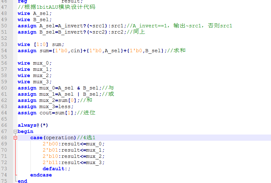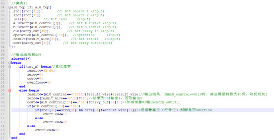 `timescale?1ns/1ps ////////////////////////////////////////////////////////////////////////////////// //?Company: //?Engineer: // //?Create?Date:???? //?Design?Name: //?Module?Name:????alu //?Project?Name: //?Target?Devices: //?Tool?versions: //?Description: // //?Dependencies: // //?Revision: //?Revision?0.01?-?File?Created //?Additional?Comments: // ////////////////////////////////////////////////////////////////////////////////// module?alu( ????rst_n,?????????//?negative?reset????????????(input) ????????????src1,??????????//?32?bits?source?1??????????(input) ????????????src2,??????????//?32?bits?source?2??????????(input) ????????????ALU_control,???//?4?bits?ALU?control?input??(input) ????????????result,????????//?32?bits?result????????????(output) ????????????zero,??????????//?1?bit?when?the?output?is?0,?zero?must?be?set?(output) ????????????cout,??????????//?1?bit?carry?out???????????(output) ????????????overflow???????//?1?bit?overflow????????????(output) ????????????); input???????????rst_n; input??[32-1:0]?src1; input??[32-1:0]?src2; input???[4-1:0]?ALU_control; output?[32-1:0]?result; output??????????zero; output??????????cout; output??????????overflow; reg????[32-1:0]?result; reg?????????????zero; reg?????????????cout; reg?????????????overflow; //根据32bitALU设计代码 //调用32个1bitALU模块 wire?[32-1:0]?carry_out; wire?[32-1:0]?result_wire; //模块0 alu_top?i0_alu_top( .src1(src1[0]),???????//1?bit?source?1?(input) .src2(src2[0]),???????//1?bit?source?2?(input) .less(1),???????//1?bit?less?????(input) .A_invert(ALU_control[3]),???//1?bit?A_invert?(input) .B_invert(ALU_control[2]),???//1?bit?B_invert?(input) .cin(1'b0),????????//1?bit?carry?in?(input) .operation(ALU_control[1:0]),??//operation??????(input) .result(result_wire[0]),?????//1?bit?result???(output) .cout(carry_out[0])??????//1?bit?carry?out(output) ); //使用FOR循环调用1~30模块 generate genvar?i; for?(i=1;i<31;i=i+1)begin:alu_num alu_top?i1_alu_top( .src1(src1[i]),???????//1?bit?source?1?(input) .src2(src2[i]),???????//1?bit?source?2?(input) .less(0),???????//1?bit?less?????(input) .A_invert(ALU_control[3]),???//1?bit?A_invert?(input) .B_invert(ALU_control[2]),???//1?bit?B_invert?(input) .cin(carry_out[i-1]),????????//1?bit?carry?in?(input) .operation(ALU_control[1:0]),??//operation??????(input) .result(result_wire[i]),?????//1?bit?result???(output) .cout(carry_out[i])??????//1?bit?carry?out(output) ); end endgenerate //模块31 alu_top?i31_alu_top( .src1(src1[31]),???????//1?bit?source?1?(input) .src2(src2[31]),???????//1?bit?source?2?(input) .less(0),???????//1?bit?less?????(input) .A_invert(ALU_control[3]),???//1?bit?A_invert?(input) .B_invert(ALU_control[2]),???//1?bit?B_invert?(input) .cin(carry_out[30]),????????//1?bit?carry?in?(input) .operation(ALU_control[1:0]),??//operation??????(input) .result(result_wire[31]),?????//1?bit?result???(output) .cout(carry_out[31])??????//1?bit?carry?out(output) ); //输出结果和ZCV always@(*)? begin