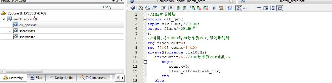 //2Hz生成模块 module?clk_gen( input?clk100Hz,//100Hz output?flash//2Hz信号 ); //消抖,将100Hz时钟分频到2Hz,即闪烁时钟 reg?flash_clk=0; reg?[7:0]?count=8'd0; always@(posedge?clk100Hz) if(count>=25)//100分频到2Hz计数25 begin count<=0; flash_clk<=~flash_clk; end else count<=count+1;//计数 assign?flash=flash_clk; endmodule
