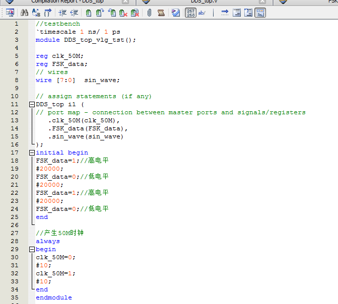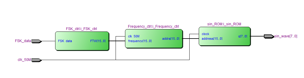 `timescale?1ns?/?1ps //FSK调制,使用DDS产生波形 module?DDS_top( ????input?clk_50M,//时钟频率50MHz ?input?FSK_data,//FSK调制信号,控制输出不同频率的正弦波 ????output?[7:0]?sin_wave//输出FSK调制波形 ????); ? //波形?ROM?地址位数?n=16 wire?[15:0]?addra; wire?[15:0]?FTW; //sin波ROM sin_ROM?i_sin_ROM?( ??.clock(clk_50M),????//?input?wire?clka ??.address(addra),??//?input?wire?[15?:?0]?addra ??.q(sin_wave)??//?output?wire?[7?:?0]?douta ); //调制模块 FSK_ctrl?i_FSK_ctrl( .?FSK_data(FSK_data),//FSK调制信号,控制输出不同频率的正弦波 .?FTW(FTW)//频率控制字,值越大,输出频率越大 ????); //相位累加器 Frequency_ctrl?i_Frequency_ctrl( .?clk_50M(clk_50M), .?frequency(FTW),//频率控制字,值越大,输出频率越大 .?addra(addra)//输出地址 ????); ? ? endmodule