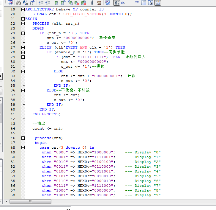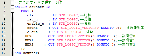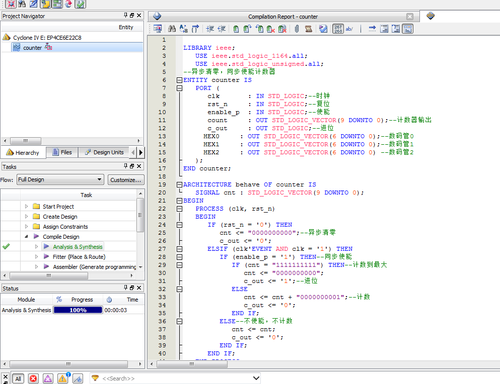 名称:异步清零同步使能计数器设计VHDL代码Quartus仿真