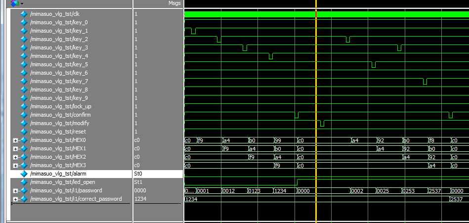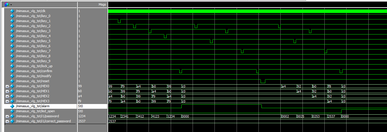 按下reset信号关闭报警,才能再次密码,关闭报警后输入新密码2537,将锁打开。