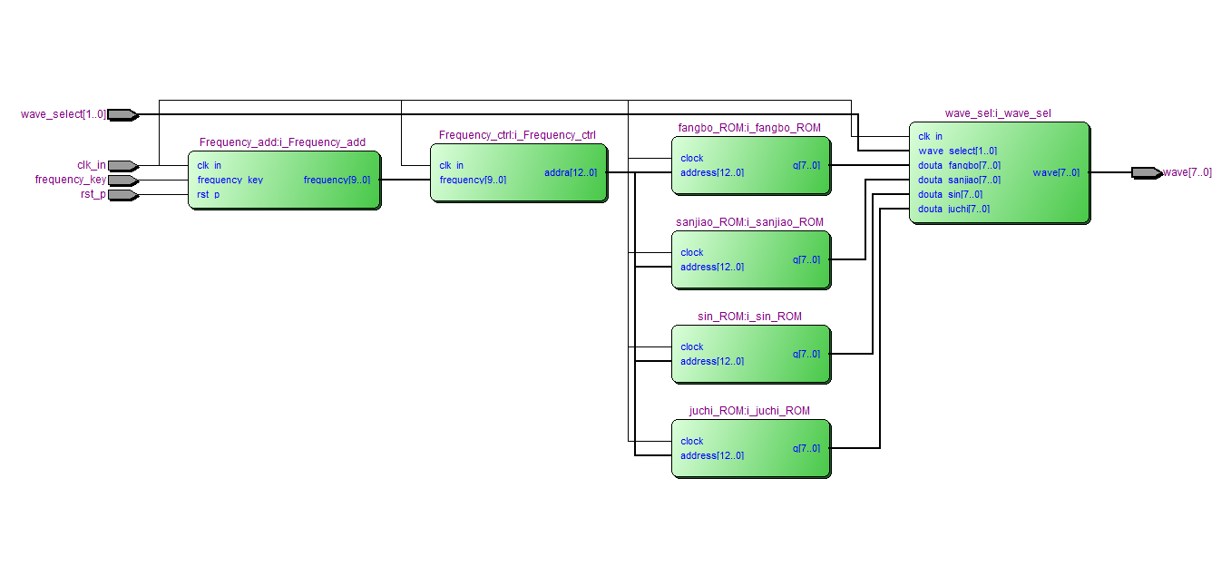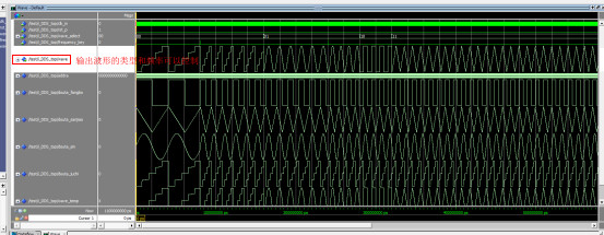 上图中,wave_select选择波形类型,01输出sin,10输出方波,11输出三角波,00阶梯波。