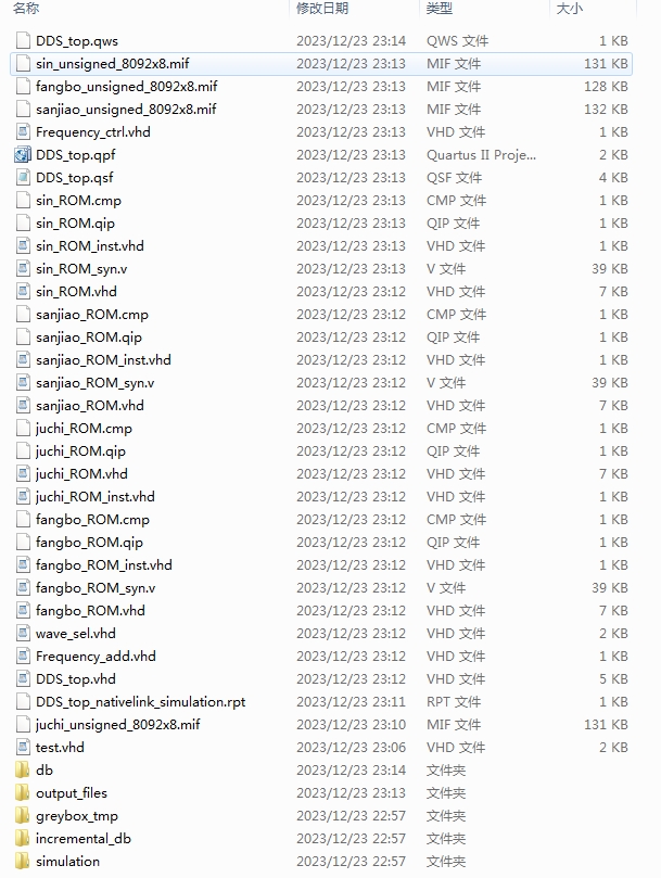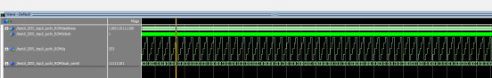 LIBRARY?ieee; ???USE?ieee.std_logic_1164.all; USE?ieee.std_logic_unsigned.all; --DDS频率等于clk*N/2^13,clk为输入时钟,N为频率控制字frequency;2^13是因为ROM里面存储了8192个点,相位累加器位宽为13位 ENTITY?DDS_top?IS ???PORT?( ??????clk_in??????:?IN?STD_LOGIC;--时钟 rst_p:?IN?STD_LOGIC;--复位 ??????wave_select??:?IN?STD_LOGIC_VECTOR(1?DOWNTO?0);--01输出sin,10输出方波,11输出三角波,00阶梯波 ??????frequency_key????:?IN?STD_LOGIC;--频率控制按键 wave?????????:?OUT?STD_LOGIC_VECTOR(7?DOWNTO?0)--输出波形 ???); END?DDS_top; ARCHITECTURE?behave?OF?DDS_top?IS --例化模块 --波形选择模块 ???COMPONENT?wave_sel?IS ??????PORT?( ?????????clk_in??????:?IN?STD_LOGIC; ?????????wave_select??:?IN?STD_LOGIC_VECTOR(1?DOWNTO?0); ?????????douta_fangbo?:?IN?STD_LOGIC_VECTOR(7?DOWNTO?0); ?????????douta_sanjiao?:?IN?STD_LOGIC_VECTOR(7?DOWNTO?0); ?????????douta_sin????:?IN?STD_LOGIC_VECTOR(7?DOWNTO?0); douta_juchi??:?IN?STD_LOGIC_VECTOR(7?DOWNTO?0); ?????????wave?????????:?OUT?STD_LOGIC_VECTOR(7?DOWNTO?0) ??????); ???END?COMPONENT; ??? --相位累加器模块 ???COMPONENT?Frequency_ctrl?IS ??????PORT?( ?????????clk_in??????:?IN?STD_LOGIC; ?????????frequency????:?IN?STD_LOGIC_VECTOR(9?DOWNTO?0); ?????????addra????????:?OUT?STD_LOGIC_VECTOR(12?DOWNTO?0) ??????); ???END?COMPONENT; --ROM表 COMPONENT?sin_ROM?IS PORT ( address:?IN?STD_LOGIC_VECTOR?(12?DOWNTO?0); clock:?IN?STD_LOGIC??:=?'1'; q:?OUT?STD_LOGIC_VECTOR?(7?DOWNTO?0) ); END?COMPONENT; --ROM表 COMPONENT?fangbo_ROM?IS PORT ( address:?IN?STD_LOGIC_VECTOR?(12?DOWNTO?0); clock:?IN?STD_LOGIC??:=?'1'; q:?OUT?STD_LOGIC_VECTOR?(7?DOWNTO?0) ); END?COMPONENT; --ROM表 COMPONENT?sanjiao_ROM?IS PORT ( address:?IN?STD_LOGIC_VECTOR?(12?DOWNTO?0); clock:?IN?STD_LOGIC??:=?'1'; q:?OUT?STD_LOGIC_VECTOR?(7?DOWNTO?0) ); END?COMPONENT; --ROM表 COMPONENT?juchi_ROM?IS PORT ( address:?IN?STD_LOGIC_VECTOR?(12?DOWNTO?0); clock:?IN?STD_LOGIC??:=?'1'; q:?OUT?STD_LOGIC_VECTOR?(7?DOWNTO?0) ); END?COMPONENT;