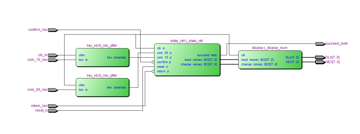 module?auto_sell( input?clk_in,//时钟 input?reset_n,//复位 input?coin_10_key,//投币1.0元 input?coin_05_key,//投币0.5元 input?confirm_key,//确认 input?return_key,//退币 output?succeed_ledn, output?[7:0]?DLA,//数码管位选,低电平选择 output?[7:0]?HEX//数码管段选,低亮 ); wire?[7:0]?input_money_BCD;//投币金额 wire?[7:0]?change_money_BCD;//找钱 wire?coin_10_p;//投币1.0元 wire?coin_05_p;//投币0.5元 //按键上升沿检测模块 key_xd?i0_key_jitter( .?clkin(clk_in),????? .?key_in(coin_10_key),//输入 .?key_posedge(coin_10_p)//按键上升沿检测 ); //按键上升沿检测模块 key_xd?i2_key_jitter( .?clkin(clk_in),????? .?key_in(coin_05_key),//输入 .?key_posedge(coin_05_p)//按键上升沿检测 ); //状态控制模块 state_ctrl?i_state_ctrl( .?clk_in(clk_in),//时钟100Hz .?reset_n(reset_n),//系统复位 .?coin_10_p(coin_10_p),//投币1.0元 .?coin_05_p(coin_05_p),//投币0.5元 .?return_p(~return_key),//退币键 .?confirm_p(~confirm_key),//确认 .?succeed_ledn(succeed_ledn), .?input_money_BCD(input_money_BCD),//投币金额 .?change_money_BCD(change_money_BCD)//找钱 );