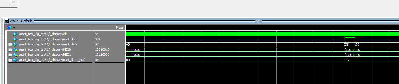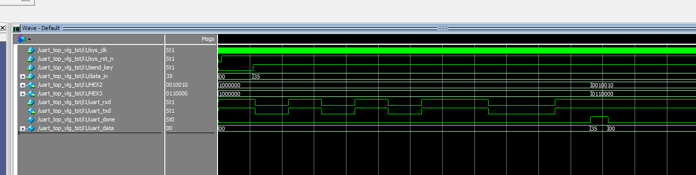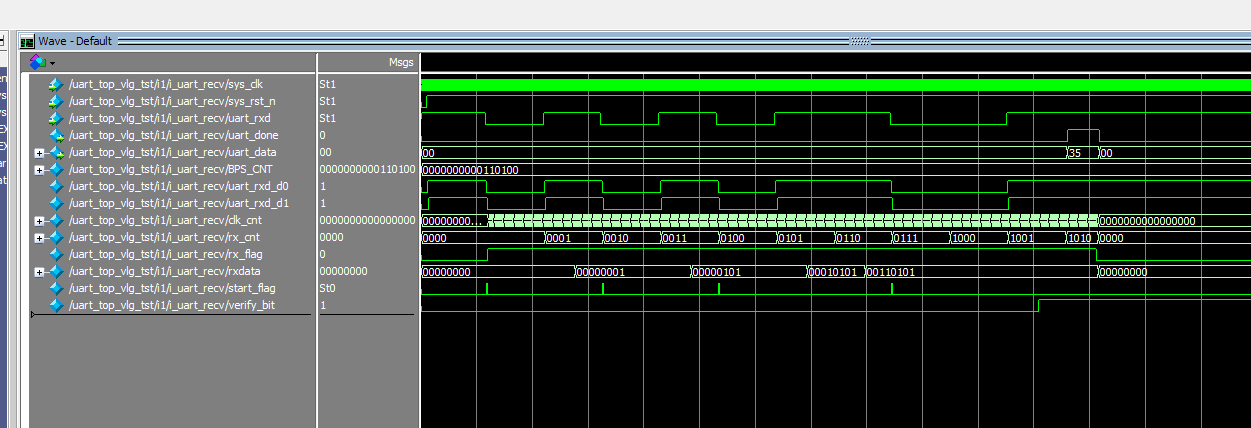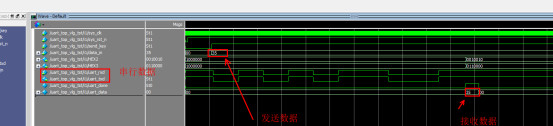 将发送端口和接收端口回环,控制发送数据为0x35,观察仿真输出的串行信号,接收端收到串行信号后解析出数据为0x35,表示发送和接收正确。