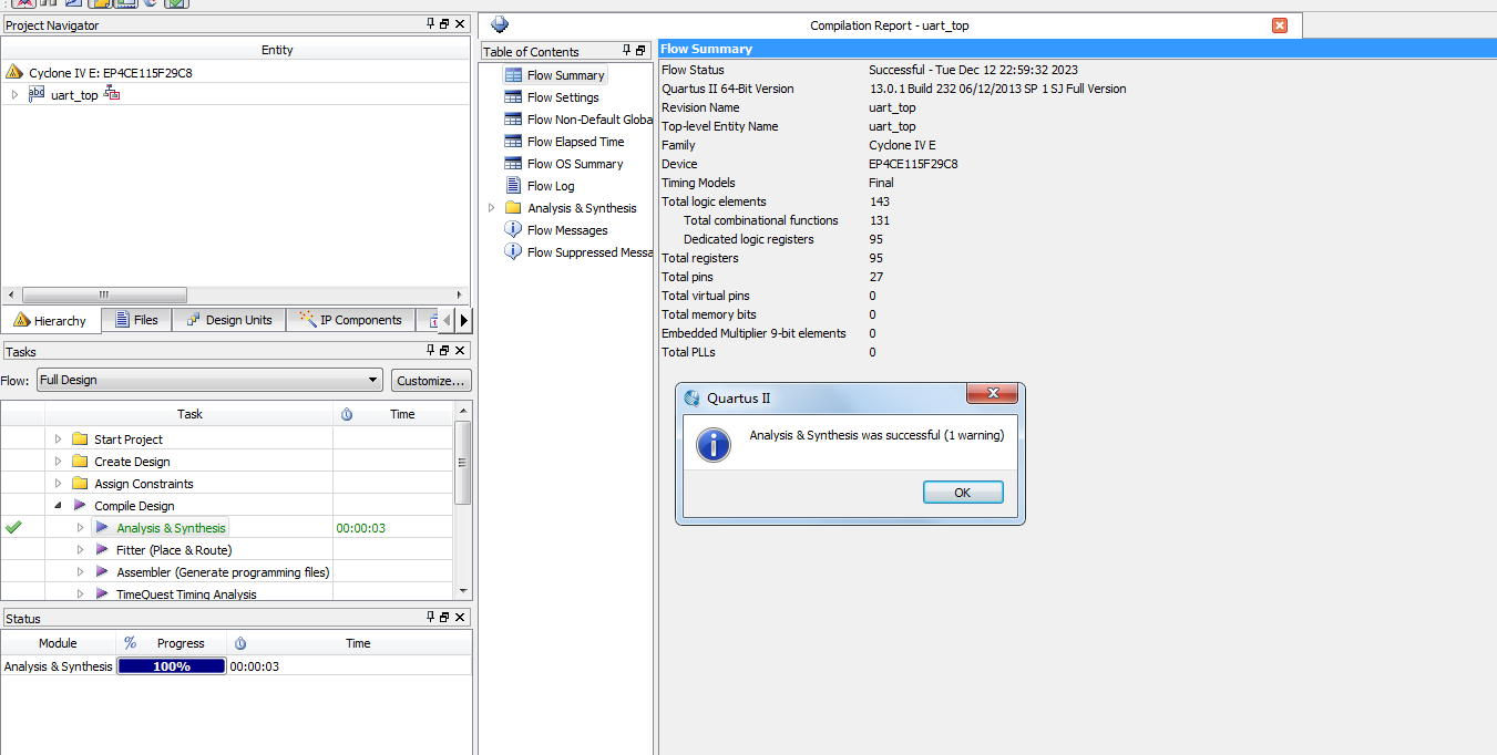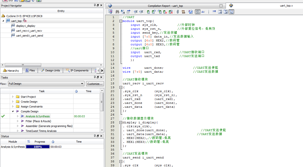 名称:简易全双工串行数据收发器UART)设计Verilog代码Quartus仿真